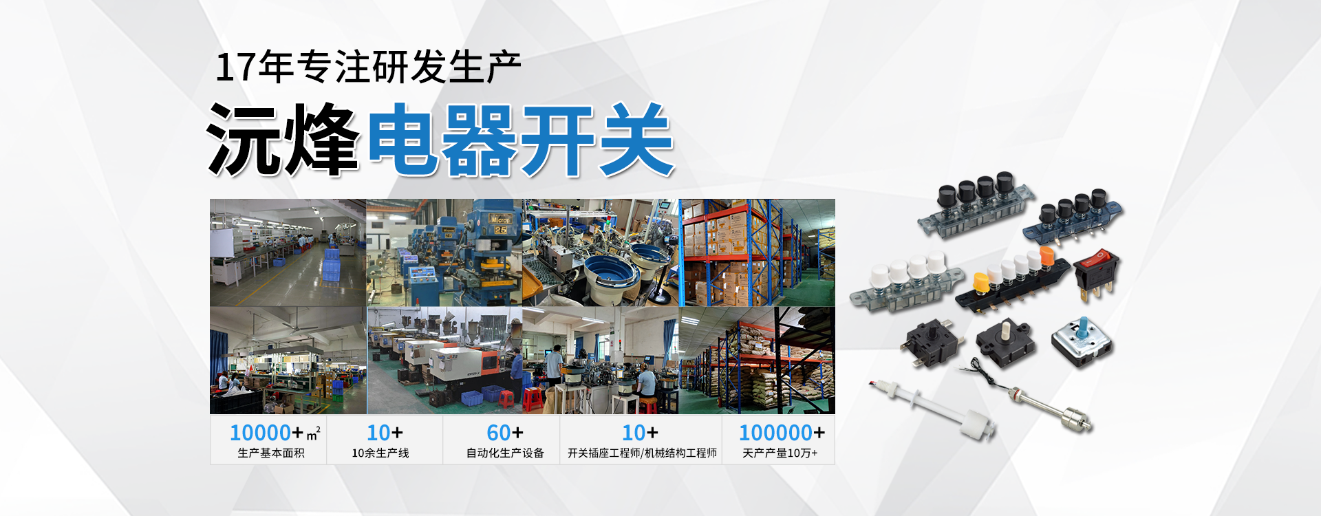 主要生產浮球開關、接近開關、琴鍵開關、旋轉開關、微動開關、船型開關、拉線開關以及接線座等系列產品。